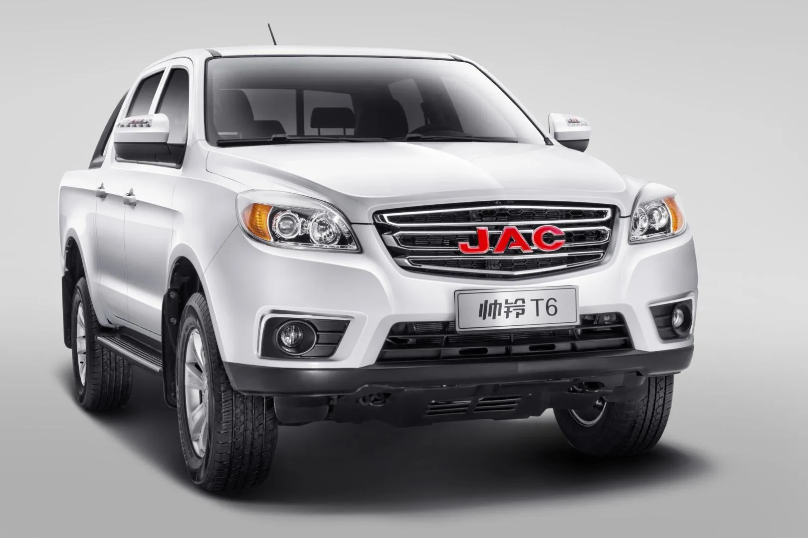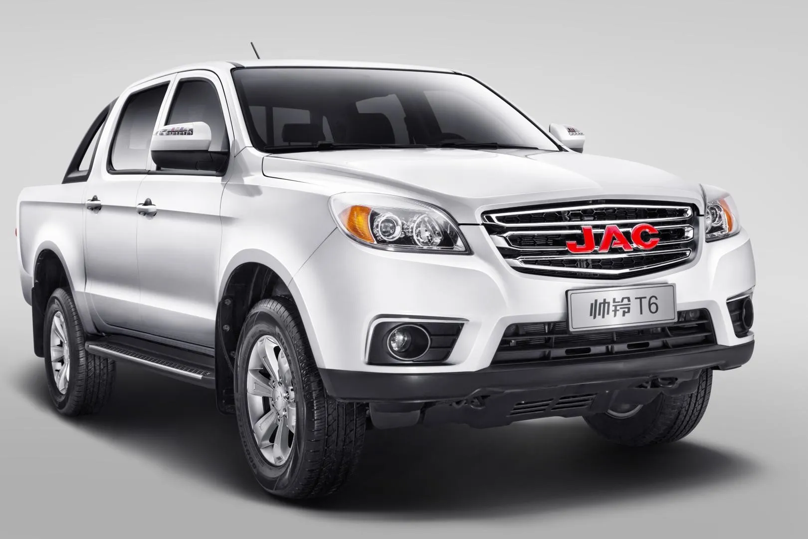 Внешность китайского пикапа JAC T6 в действительности внушительна. Автомобиль выглядит мощно и немного грозно. Все из-за размеров пикапа. Достаточно только взглянуть на 17-дюймовые диски и высокий клиренс. По мощному внешнему виду сразу становится понятно, что автомобиль проедет не только по городским дорогам, но и в труднопроходимых местах.