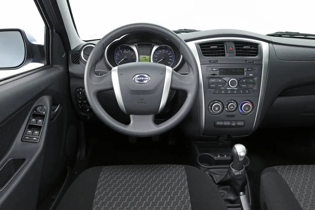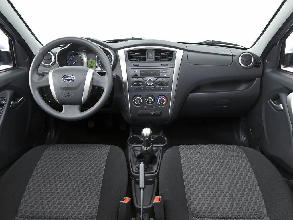 Вдоволь налюбовавшись необычным и ярким внешним видом седана Datsun On-Do можно переходить к оцениванию интерьера. Салон выглядит привлекательно и без лишних украшательств. Можно даже сказать, что для создания интерьера использовалась философия минимализма.