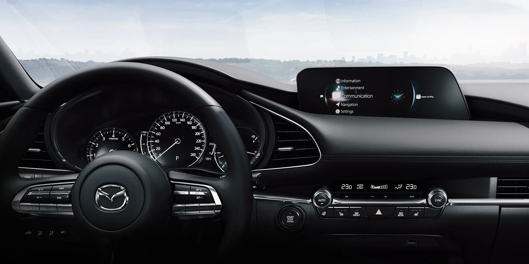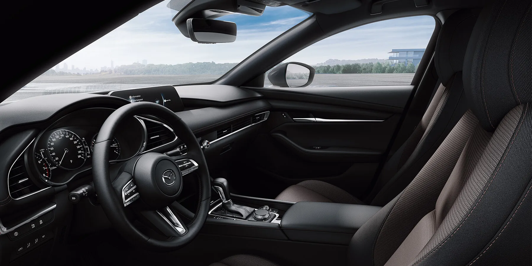 Интерьер в Mazda 3 можно назвать стильным, а также роскошным. Роскошь в салоне достигается удивительными отделочными материалами. Они не только высокого качества, но и выглядят дорого. Отделка салона приятна на ощупь и визуально. Естественно в отделке интерьера не видать никаких огрехов.