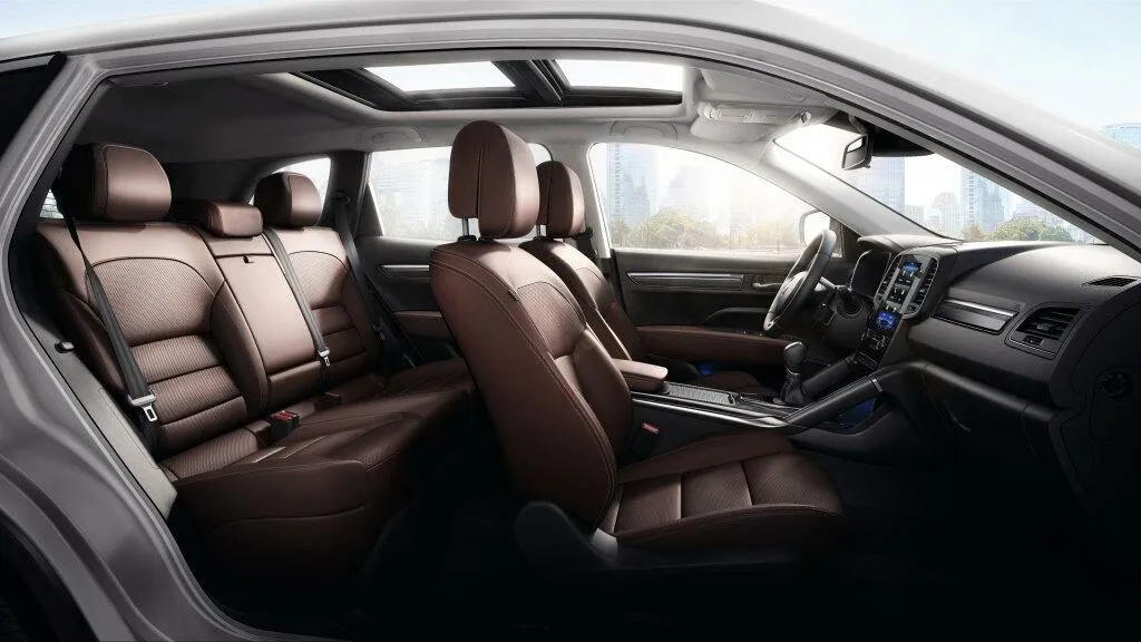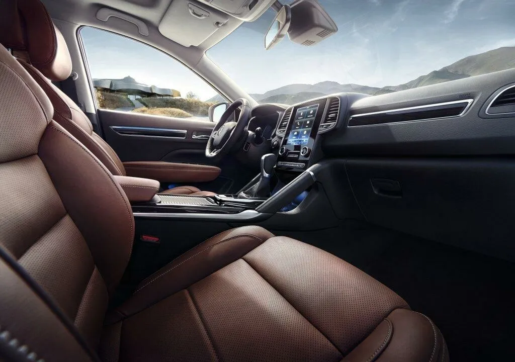 Помимо стильной приборной панели современности в интерьер приносит большой 8,7-дюймовый сенсорный дисплей. Причем экран мультимедийной системы весьма необычно расположен. Обычно многие экраны располагаются горизонтально, но у Колеоса экран стоит вертикально. Такое расположение весьма притягательно и интересно. К тому же центральная консоль не захламлена многообразием кнопок. Поэтому сенсорный дисплей смотрится привлекательнее.