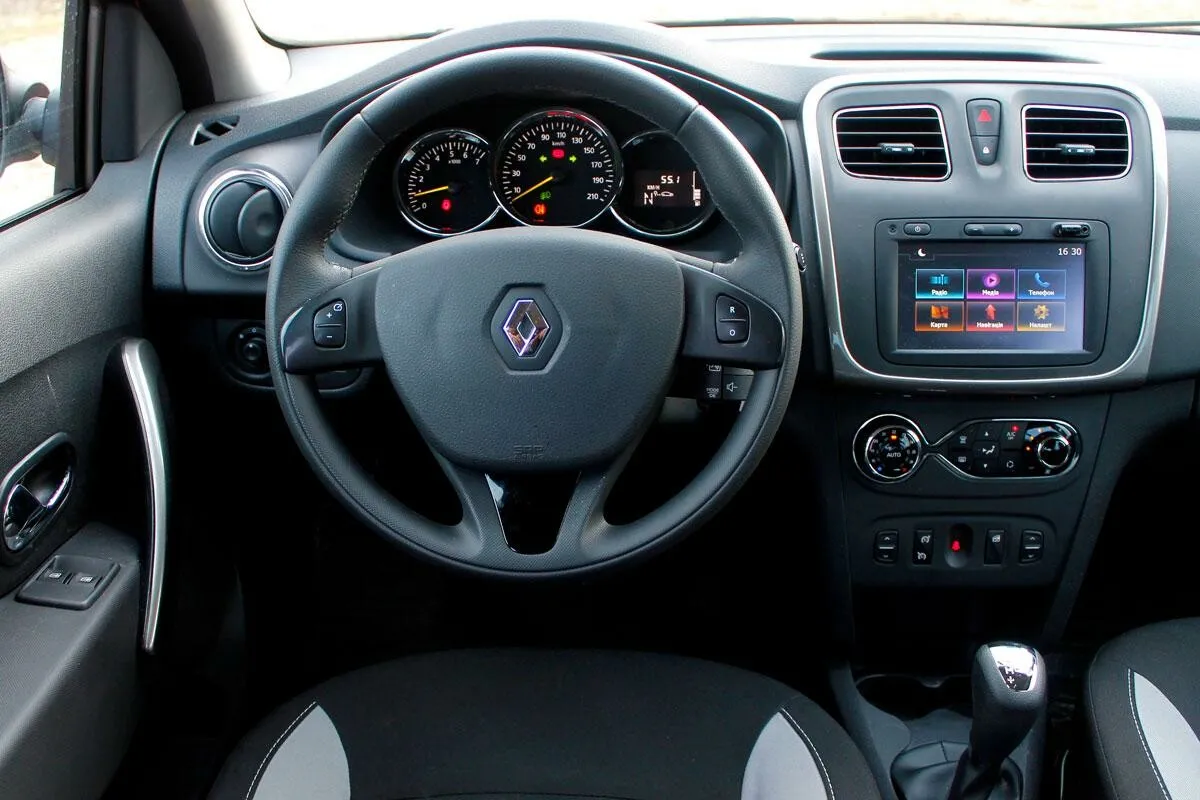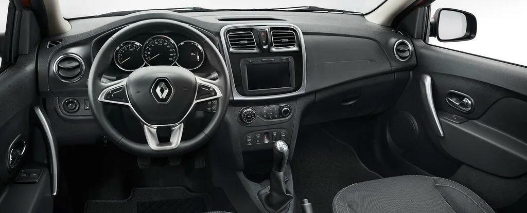 Салон автомобиля Renault Sandero выполнен довольно неплохо. Это относится как к общей стилистике, так и к отделке. Салон автомобиля отделан на отлично, так что различных щелей найти не получится. Материалы, которые использовались в отделке салона, являются высококачественными. Поэтому ничего не скрипит и не гремит. Также материалы хоть и немного дубовые, все же они приятны на ощупь и визуально привлекательны. Добавление серебристых элементов лишь украшают автомобиль.